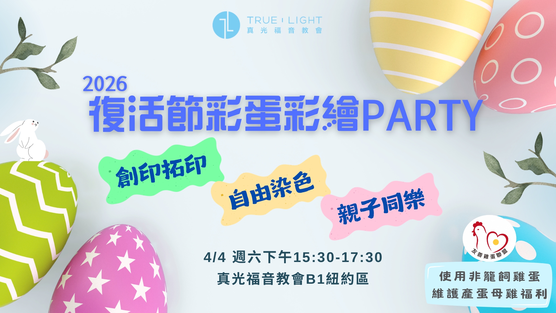 真光福音教會是一間友善動物和關心環境的教會,我們的禮拜堂是動物友善空間,每年復活節彩蛋都是使用「非籠飼雞蛋」,是沒有被關在A4大小的格子籠、並且在草原自由跑跳的快樂雞所下的健康雞蛋🥚。同時我們也要用環保素材 (食用色素,非塑膠膜) 為雞蛋畫上獨一無二的繽紛色彩!一起來發揮上帝放在你裡面的藝術與創意!歡迎參加這場復活節彩蛋PARTY!