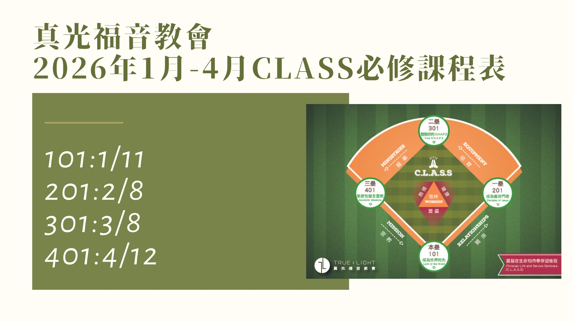C.L.A.S.S. 課程是讓來到真光福音教會的新舊朋友認識信仰,以「跑壘包」的概念與行動,得著生命突破、信仰成熟的豐富課程。
